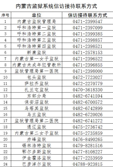为进一步加强内蒙古监狱系统信访接待规范化建设,畅通群众反映问题渠道,现将内蒙古监狱系统信访接待联系方式公示如下。